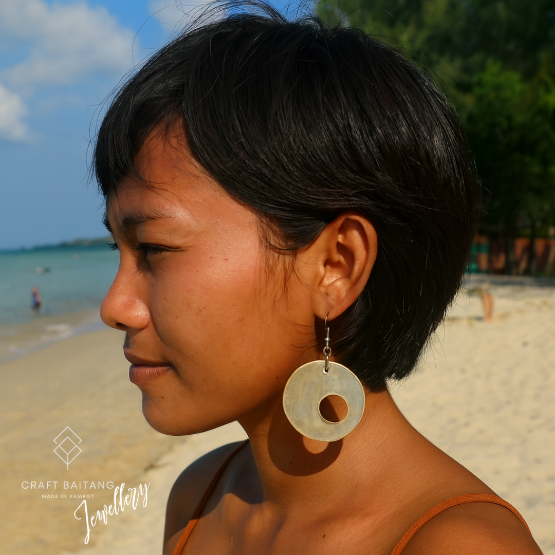 A bold 5cm shell circle cut and engraved dots, blending natural textures with elegance. Lightweight, versatile, and handcrafted in Cambodia, with 925 silver hooks for a refined finish.