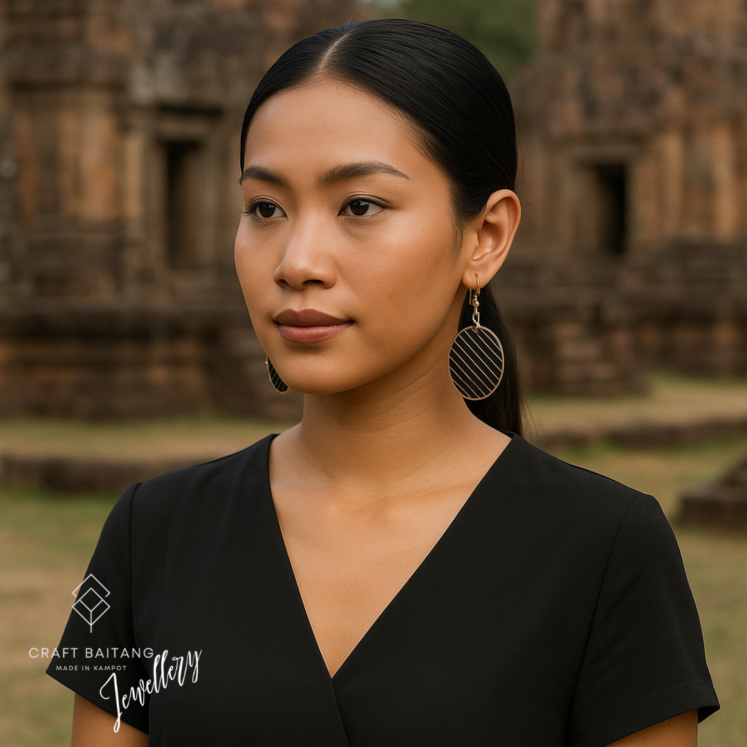 A bold 5cm shell circle cut and stripes engraved , blending natural textures with elegance. Lightweight, versatile, and handcrafted in Cambodia, with 925 silver hooks for a refined finish.